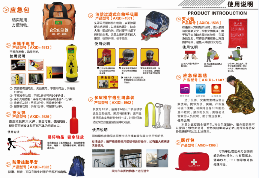 同時,消防應急包對于我們來說也是不可缺少的,應急包中的防毒面罩緩降器、逃生繩、滅火彈、滅火毯、應急手電筒等在火災初期對于我們來說還是有幫助的,在火災萌芽時段能消滅火災對于我們個人來說也是非常重要的