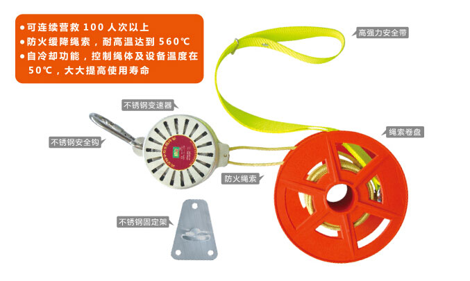 青島億和海麗安防科技有限公司與清華大學聯合研發的“安心牌”高層樓宇緩降器,采用自冷卻技術,使產品更加安全可靠,是高層住宅必備的逃生產品。該產品可連續營救100人次以上,防火緩降繩索耐高溫可達到560℃,自冷卻功能控制繩體及設備溫度在50℃左右,適用于200米以下高層逃生,獲山東省名牌產品山東省安全生產科學技術進步二等獎,入選國家安全生產“千項”產品推廣目錄,填補了國內空白,達到國際先進水平。