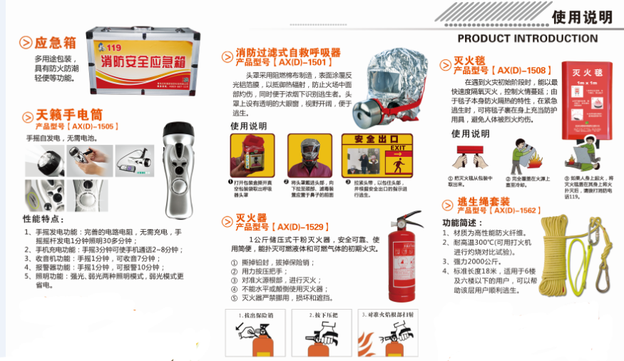 但對于一般家庭來說,消防四件套就夠了。據相關統計數據,約90%的火災受害者,直接死于燃燒中產生的毒氣和毒煙,多數受害者在被燒之前就已經窒息。所以,能夠直接起到逃生作用的消防過濾式自救呼吸器(防煙面罩)和增加逃生幾率的防火毯、手電筒是必備的,對于家庭用火用電操作不當,火災處于可控階段時,利用滅火器撲滅火源方法最可行。而對于逃生繩而言,使用起來難度比較高,適用于較低樓層和青年人。因此消防應急包中的消防四件套包含防煙面罩、防火毯、應急手電筒、滅火器。但為了增強安全保障,低樓層還是準備消防五件套,增加逃生繩。但是對于高層住宅小區,逃生緩降器比逃生繩更為實用。