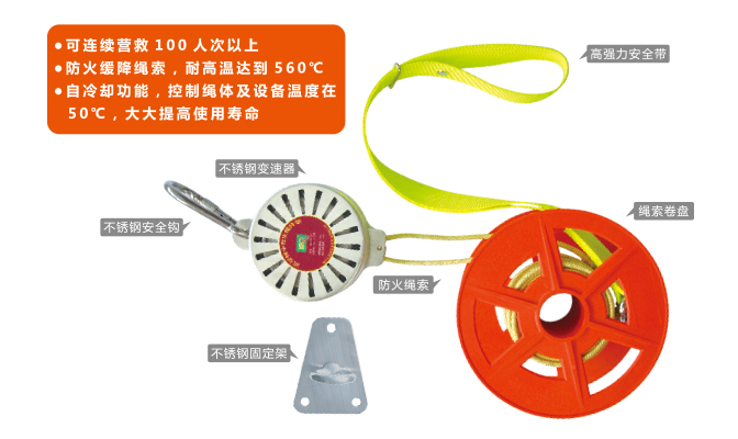 "安心"牌自冷卻高層樓宇救生緩降器擁有3項(xiàng)專利,其獨(dú)特的自冷卻功能,杜絕了緩降過(guò)程中因高溫造成的卡死現(xiàn)象,緩降繩索具有防火阻燃特性,230攝氏度高溫條件下可長(zhǎng)期使用,解決了100米高層火災(zāi)逃生的問(wèn)題。