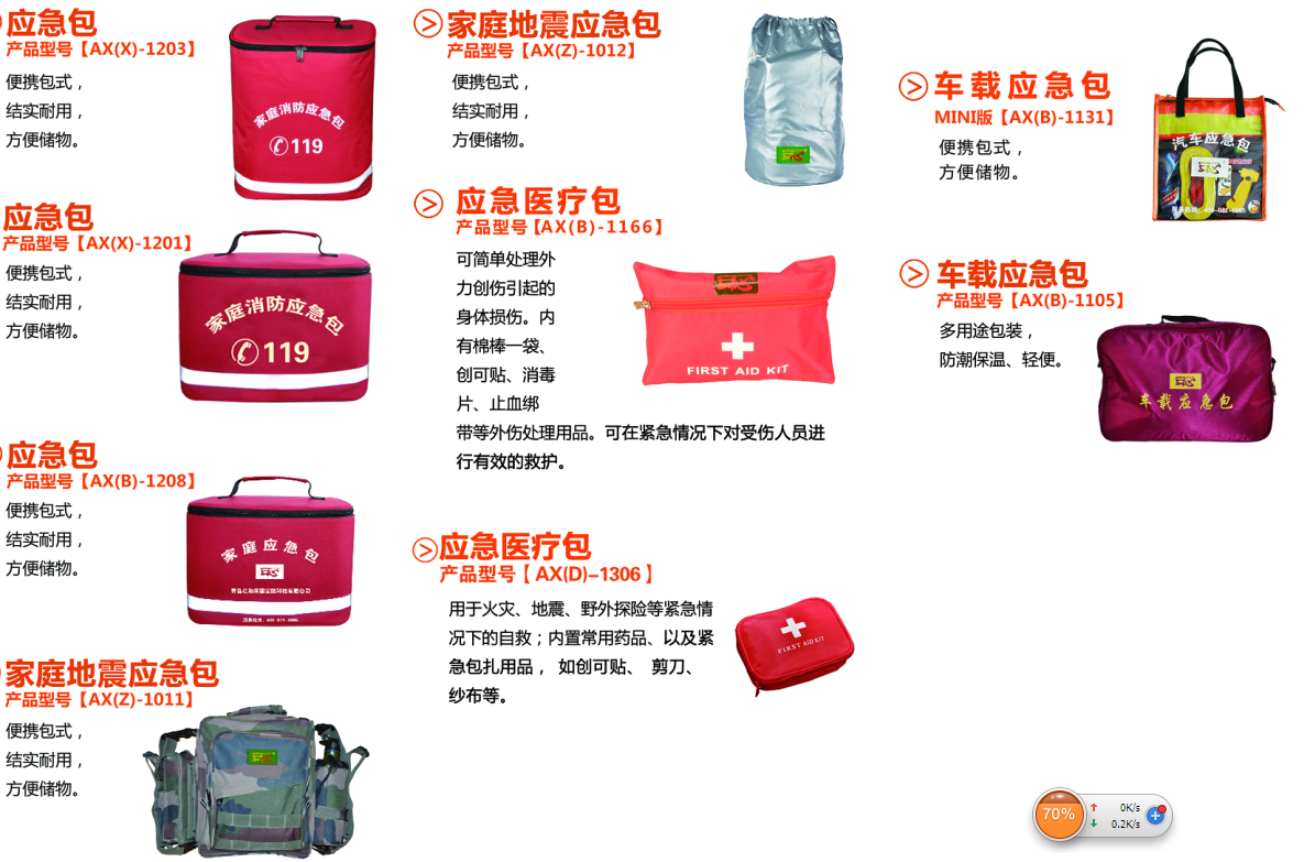 應急包可以幫助受難者自救,主要表現在為受難者提供應急工具和應急手冊。應急手冊可以告訴受難者危難中如何做才能獲救,應急工具則是幫助受難者自救了。例如當發生火災時如果你擁有火災應急包,里面的救生緩降器就可以讓你從高樓中逃生,過濾式呼吸面具可以為你在煙塵中過濾40多分鐘的煙塵讓你不至于窒息而亡,防火繩讓你從底層的樓房中逃生等等。