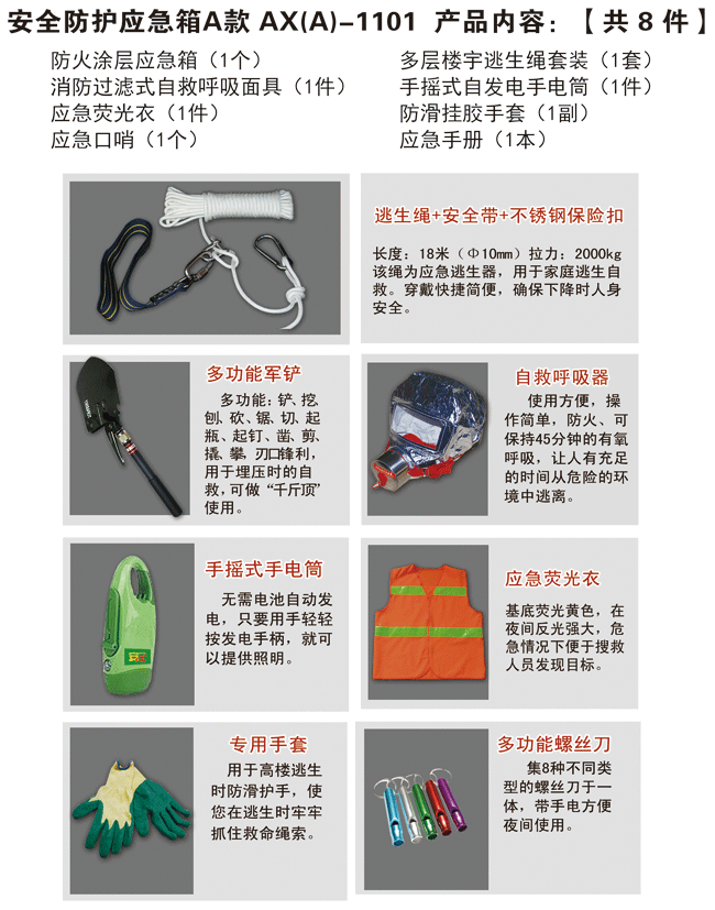 你要自救你就需要借助相關的工具。青島億和海麗為大家提供了火災應急包,火災應急包里面含有防火逃生繩(幫助我們從高樓層逃生)、消防過濾式自救呼吸面具(是我們不會再濃煙中窒息而亡),應急口哨(呼喚別人的幫助),手搖式自發電手電筒(火災斷電后的照明)等等對于火災逃生由幫助的器具。那么擁有了火災應急包,在發生事故時你能立即找到嗎?這就需要我們平時把火災應急包放到易于拿放的地方。生命只有一次,請大家各自珍重。