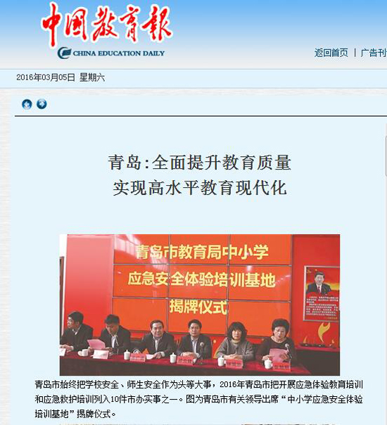 2016年青島市把開展中小學(xué)生應(yīng)急體驗教育培訓(xùn)和市民應(yīng)急救護(hù)培訓(xùn)列入10件市辦實事,未來海麗雅應(yīng)急安全教育培訓(xùn)中心將為更多的學(xué)生、百姓提供專業(yè)化應(yīng)急安全教育培訓(xùn)服務(wù),為提升社會整體應(yīng)急自救、互救技能水平貢獻(xiàn)力量。《中國教育報》關(guān)注青島市應(yīng)急教育的發(fā)展,在全國“兩會”期間,第一時間將“青島市教育局中小學(xué)應(yīng)急安全體驗培訓(xùn)基地”落戶海麗雅應(yīng)急安全教育培訓(xùn)中心消息進(jìn)行宣傳報道。