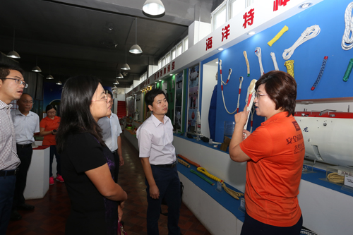 海麗雅集團副總經理、研發中心主任黃濤為陳黎明秘書一行匯報了企業質量管理工作執行情況:長期以來,在各級技術監督部門的關心指導下,海麗雅集團堅持質量強企,通過導入“卓越績效體系”、“ISO9001”、“CCC認證”等管理體系,實行“首席質量官制度”、“質量基金制度”、“董事長基金制度”,開展QC小組、五小(小建議、小革新、小攻關、小發明、小創造)等全體職工范圍的質量管理活動,打牢質量基礎,提高質量管理水平,實現了質量和經濟效益雙提升。公司相繼為國家載人潛水器“蛟龍號”、國家海洋科考船“大洋一號”、“科學號”配套特種繩纜,打破了國外壟斷局面。2016年8月,我國深海科考進入“萬米時代”,本次科考中,公司為海底探測地震儀布放配套特種繩纜,并成功獲取完整地震剖面,保護了國家科研成果。在產品展廳,海麗雅集團董事長張旭明為陳黎明秘書一行展示了這些海洋科考的“功臣”繩纜。此外,董事長張旭明為調研領導介紹了應急產品及“體驗式”應急安全培訓的創新發展成果。