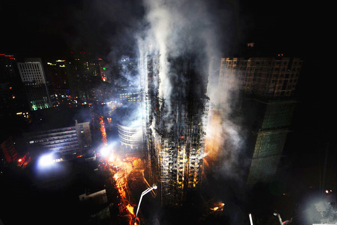 2010年11月15日,上海靜安區余姚路膠州路一正在進行外立面墻壁施工的28層住宅由于4名電焊工無證違規操作,引燃周圍易燃物,腳手架突發大火。在救援過程中,消防車云梯達不到著火大樓頂部的高度,云梯加上高壓水槍只能到達大樓三分之二的高度,火勢太大直升飛機不能靠近,阻撓了救援工作的順利進行。最終導致58人遇難,70余人受傷,房產損失接近5億元人民幣。