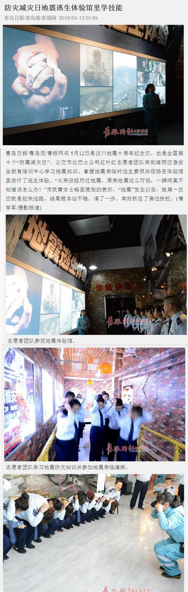 5月12日是汶川地震十周年紀念日,也是全國第十個“防震減災日”。公交市北巴士公司紅葉紅志愿者團隊來到海麗應急安全教育培訓中心學習地震知識、掌握地震來臨時逃生要領并現場在體驗館里進行了逃生體驗。“從來沒經歷過地震,原來地震這么可怕,一瞬間真不知道該怎么辦!”市民黃女士略顯慌張的表示,“地震”發生以后,她第一反應就是趕快逃跑,結果根本站不穩,滑了一步,幸好抓住了旁邊扶欄。