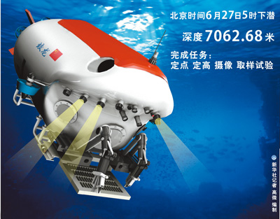 北京時(shí)間6月27日11時(shí)47分,中國(guó)“蛟龍”再次刷新“中國(guó)深度”——下潛7062米。6月3日,“蛟龍”出征以來(lái),已經(jīng)連續(xù)書(shū)寫(xiě)了5個(gè)“中國(guó)深度”新紀(jì)錄:6月15日,6671米;6月19日,6965米;6月22日,6963米;6月24日,7020米;6月27日,7062米。“很激動(dòng)也很興奮,作為研制和試驗(yàn)人員,我為‘蛟龍’號(hào)的表現(xiàn)感到自豪和驕傲。” 完成突破7000米深度目標(biāo),回到母船甲板的首席潛航員葉聰說(shuō),此次下潛比前面幾次下潛往前跨了一步,突破7000米深度,并且按照預(yù)定計(jì)劃,完成了坐底、拍攝海底景象、取水樣和布放標(biāo)志物等活動(dòng),取得了7000米海底的珍貴資料,證明了“蛟龍”在7000米級(jí)深度具備良好作業(yè)能力。