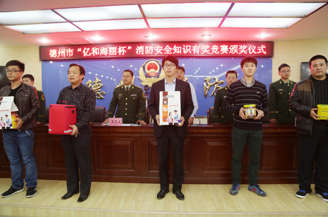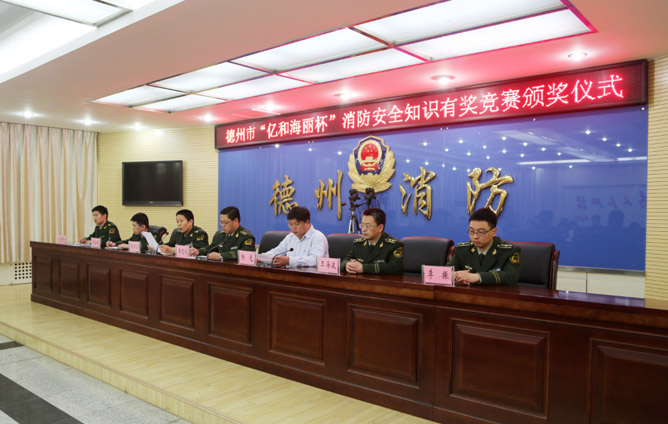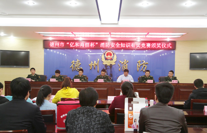 2014年3月25日“億和海麗杯”消防安全知識有獎競賽頒獎儀式在山東省德州市舉行,德州市消防支隊張保衛高級工程師通報消防安全知識有獎競賽活動開展情況,青島億和海麗副總經理楊光就本次活動發表了講話。
