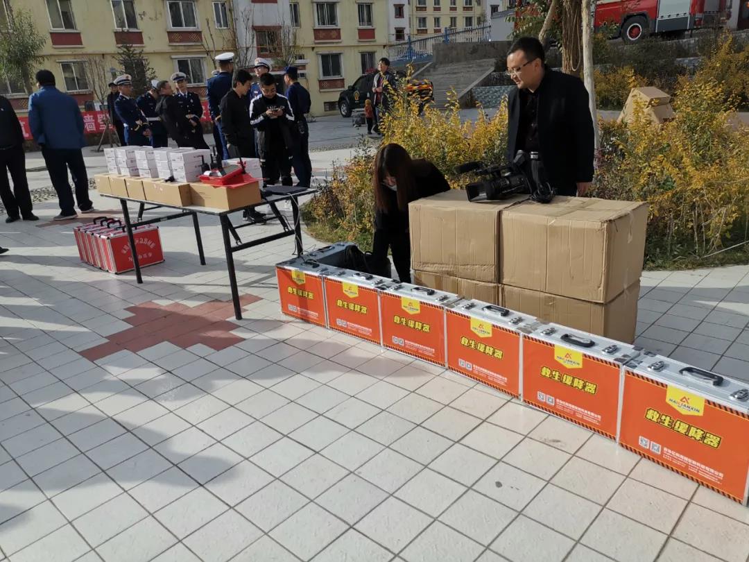甘肅省武威市天祝縣消防大隊舉行“為您辦實事高層建筑消防安全器材發放儀式”,向社區居民發放“海麗安心”逃生緩降器。