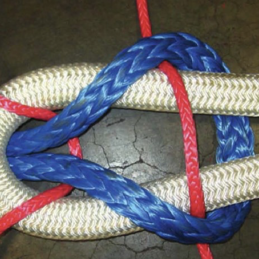 眼對眼拼接這種化纖繩的連接方式需要將兩個扣眼拼接在一起,形成永久性連接。如果要對繩纜進(jìn)行更換,則需要重新將扣眼進(jìn)行連接。這種連接方式在繩纜尺寸近似時強(qiáng)度效率最高,并且這種連接方式比雙合結(jié)強(qiáng)度損失小。
