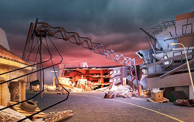 再現(xiàn)地震后,道路變形,有波浪狀也有斷裂上下錯(cuò)層的場(chǎng)景。在道路兩側(cè)有建筑物倒塌,形成通道。體驗(yàn)者從破損的通過(guò)穿過(guò),到達(dá)一個(gè)相對(duì)安全的位置。在臨近出口處,設(shè)置一條斷掉的高壓電線掉落在地上,要求體驗(yàn)者此處應(yīng)該采取單腳跳的方式離開(kāi)此區(qū)域。