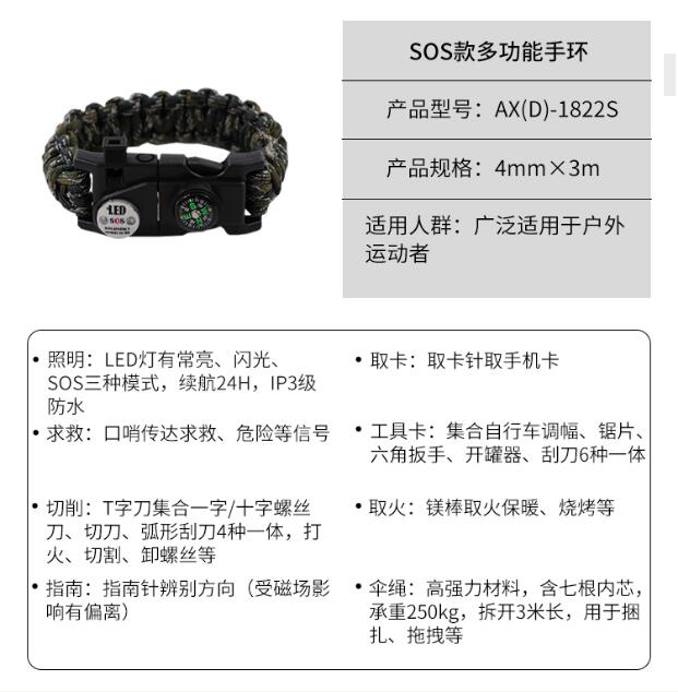 產品展示 當前位置:首頁 > 產品展示 > 戶外用品,防火救生繩及特種繩纜 > 戶外應急必備系列 > SOS款多功能手環